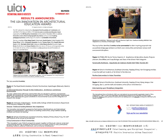 教育教学成果获国内外高度评价。2021年获国际建协建筑教育委员会主办、面向全球建筑院校开放的首届建筑教育创新奖3项(图13),亚洲无码-免费a片-台湾av 提交的根植乡土文化和国际合作实践的“生息营造”提案荣获其中亚洲地区代表性创新奖,并获得2项提名奖(“互喻式学科融通专业教育”、“城市转型的积极干预”),为全球唯一获多个奖项的院校。“面向建筑遗产保护的国际大学教育共同体建设与实践”、“面向’一带一路’的城乡规划新工科教育共同体”获批教育部第二批新工科教改项目,“基于‘做中学’的‘艺术与设计’文理工融通通识课承担开发与运用”获2021年 教育部新文科教改立项。