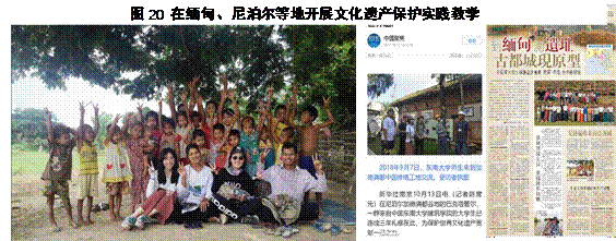 实践教学助力亚洲文化遗产保护。在联合国教科文组织、国家文物局和所在国政府的支持下,自2017年起,连续三年先后8次,组织学生近200人次以上,在缅甸、尼泊尔等国开展了文化遗产现场调查、数字测绘、规划编制等实践教学活动(图20)。受到了UNESCO亚太总部、缅甸宗教与文化部长、尼泊尔文化部、中国驻缅甸、尼泊尔大使的高度赞赏。相关教学活动被新华社、香港文汇报等主流媒体,缅甸、尼泊尔本地媒体多次报道。相关成果参加“中华传统建筑文化博览会”(北京,2017)等展览,引起热烈反响。