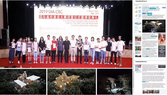 学生成果频获国际国内竞赛奖项。基于文化理解和创新实践的研究生教学成果连续三届受邀在威尼斯国际建筑双年展策展或参展平行展单元。近年摘得“挑战杯”、“互联网+”等中国大学生创新创业国赛金、银、铜奖,亚洲建筑师协会综合建筑金奖、LA纽约中央公园全球竞赛终奖、日内瓦国际发明展金奖等数十项国内外重要设计竞赛奖;中外联队两次获得国际建协高校建造大赛一等奖(图19),近两次参加中国国际太阳能十项全能竞赛均斩获总成绩三甲及部分单项第一名。所有参与硕士双学位学生论文均获都灵理工大学最优等第。