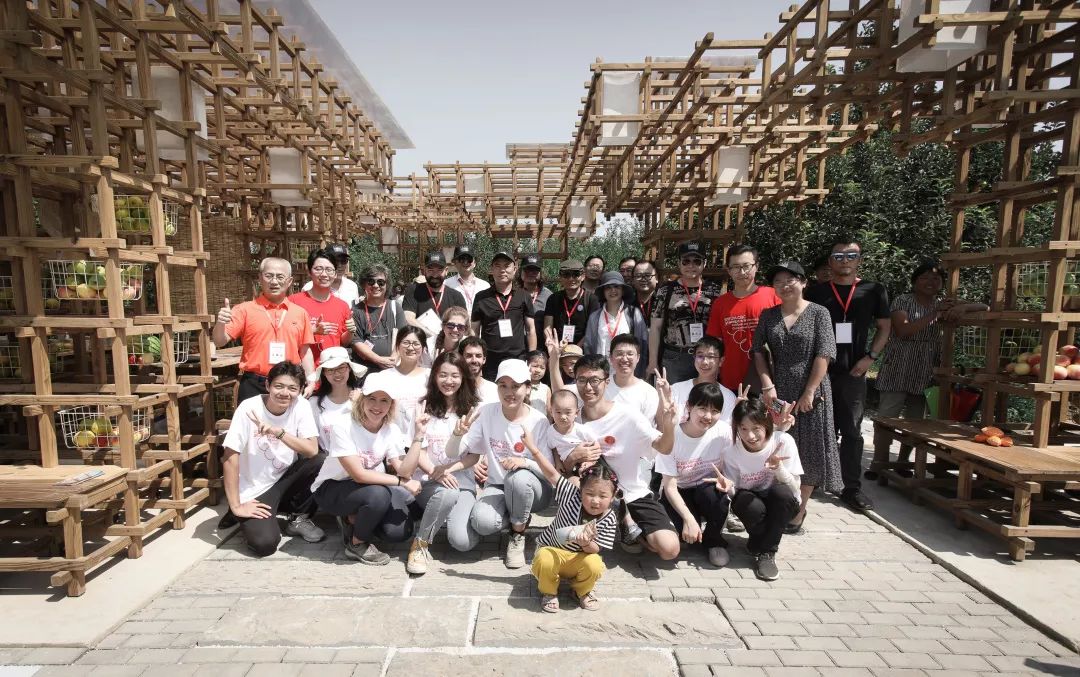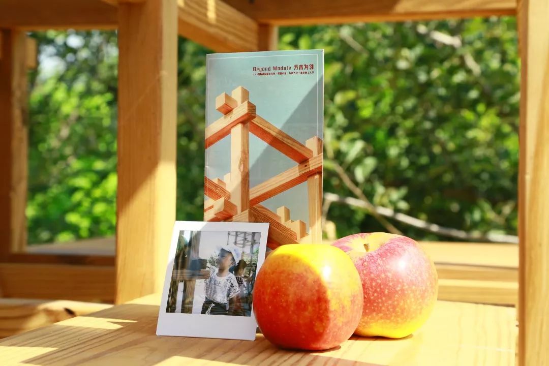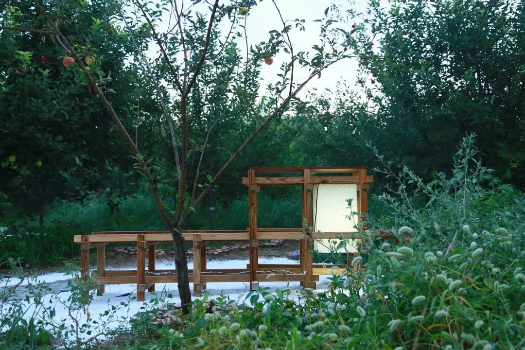 出发前夜我们还在工作室做着建造手册,到现场后,大批木材被我们分类成摞,看着木方成片、连片成柱,看着屋架从头顶越过、联合旗帜安放在木格空处、白色的灯被放飞空中、水池中洗着苹果和梨、铺地逐渐呈现出图纸中的模样。有生之年,欣喜相逢。和梨园,和你们。——胡蝶