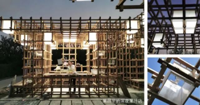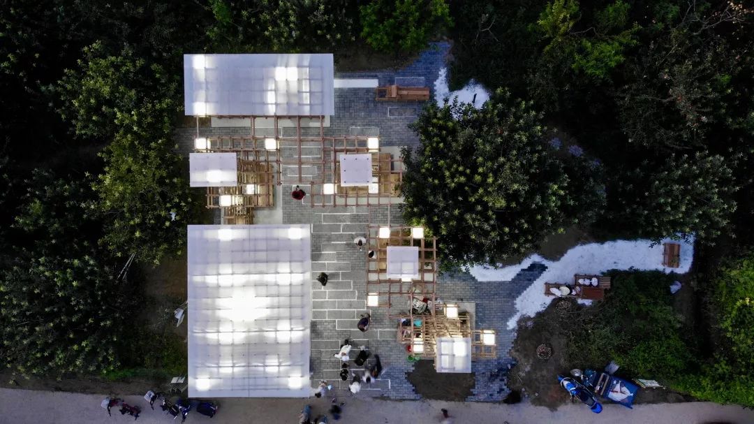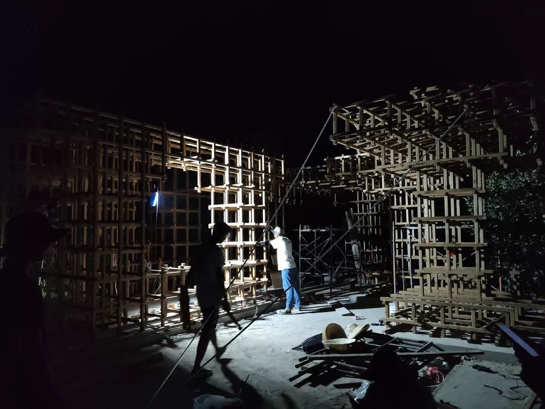 搭建的过程并未如设想的顺利,大量木材的编号整理,误差的处理,工具的调整,以及如何准确的定位,如何面对恶劣的天气等等,问题每天都在不断出现当看到整体结构立起来,屋顶灯光亮起的那一刻,心中无限感动。——甘羽