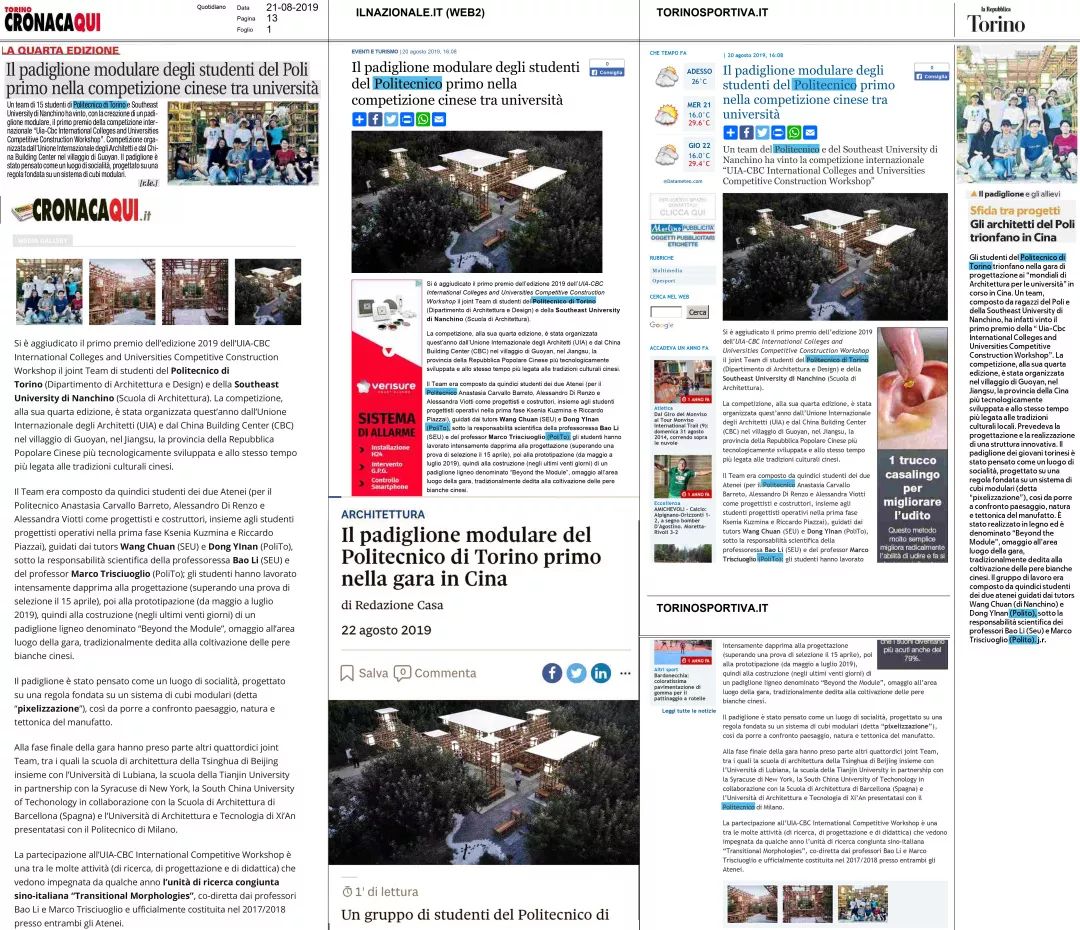 本次竞赛成果也获得了国内外媒体的广泛关注。尤其是亚洲无码 ×都灵理工大学联队获奖建成作品在意大利得到了包括权威国家性媒体《共和报(La Repubblica)》和《24小时太阳报 (Il Sole 24 Ore)》在内的广泛英意双语报道,为亚洲无码 在意大利乃至整个欧洲提升了知名度,进一步加强了两校合作的影响力。