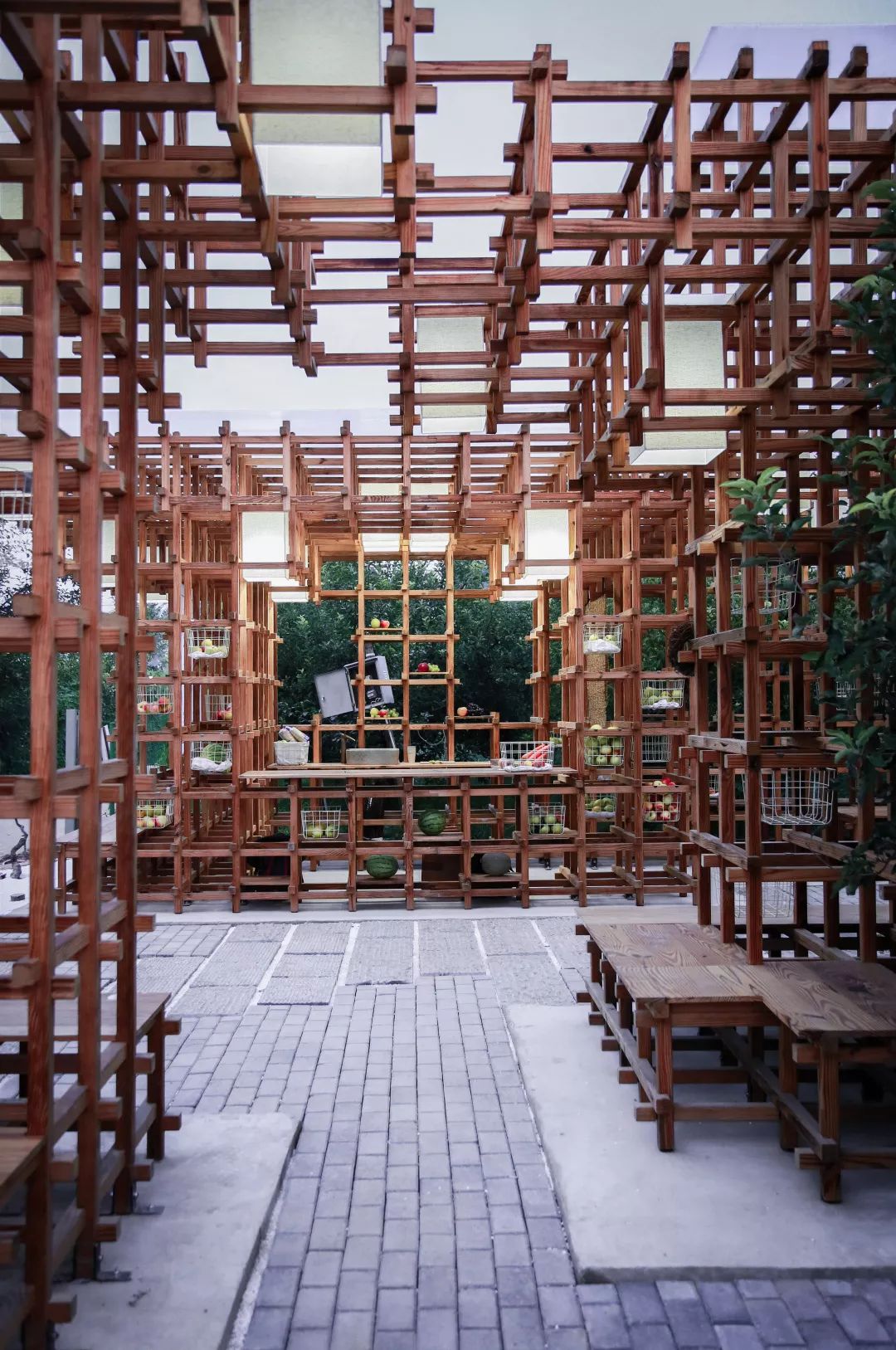 The modular space is filled with different functions, including chandeliers and fruit baskets. The human-oriented lighting, the seductive fruit and the module are tightly combined, and the function of selling fresh fruit is fantastic. At the same time, its flexibility gives the whole building a new vitality.