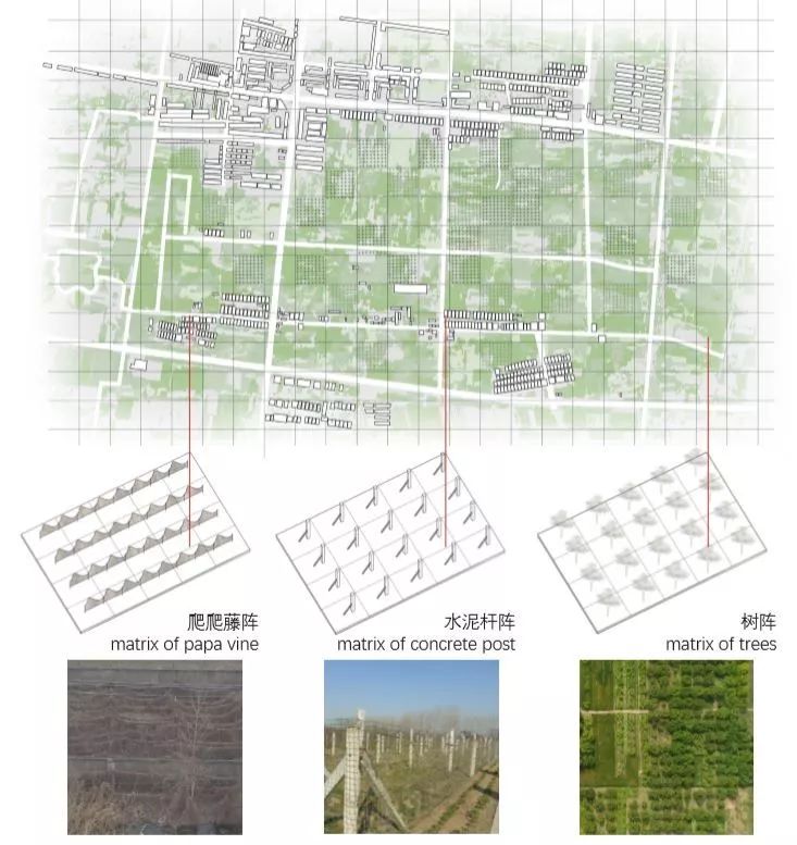方案的设计灵感来源于爱园镇大地景观中最为明显的矩阵式特征:梨树林、桃树林、苹果树林、匍匐作物的水泥桩矩阵。我们从中提取除了模块化结构的概念,以反映和适应周边矩阵式的大地风貌。这一概念可以在基地内自由地复制,创造出一个新的逻辑系统,同时其可以扩展出无数形状。