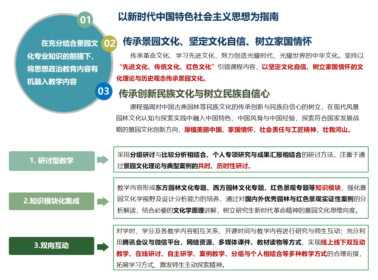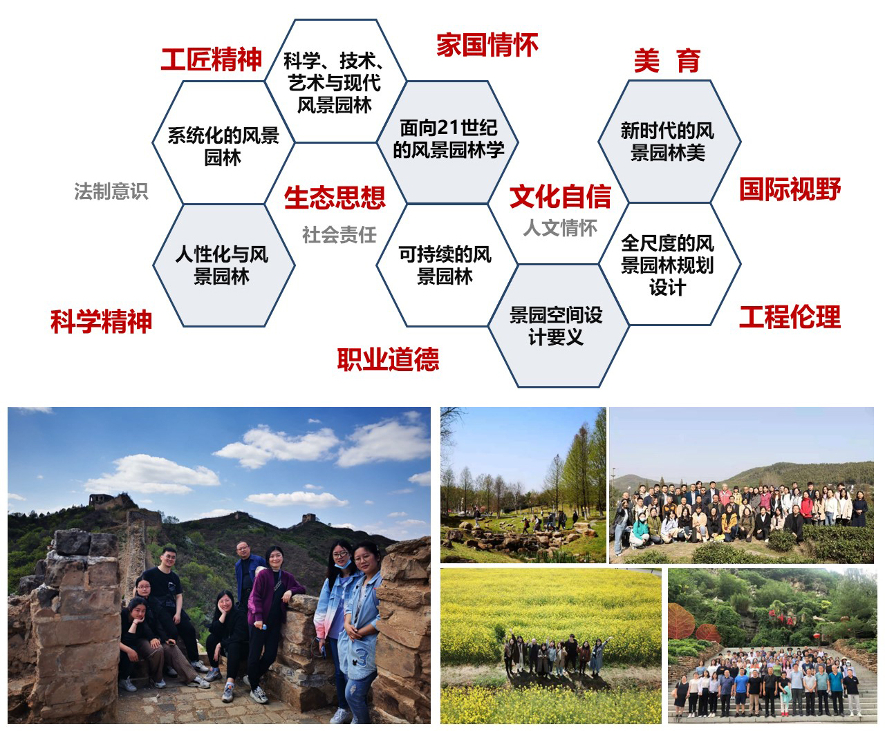 课程坚持以国际视野、中国特色、前沿意识的风景园林文化理论与研究方法引领课程内容,以坚持民族自信、家国情怀的历史理论与遗产保护研究传承景园文化,以世界优秀景园案例与文化景观解析强化思想阵地与教学优势。教学内容围绕价值塑造、能力培养、知识传授三位一体的课程建设目标,筑牢知识模块与家国情怀、文化自信、人文关怀、工程伦理、工匠精神等社会核心价值观文化元素的“触点”和“融点”,强化典型案例的教学运用。课程结合景观文化理论基础讲授,梳理当代景观文化研究体系,厘清景观设计中文化观念的动态变迁与发展趋势,深入解析当代景观设计思潮与应对策略,促进学生主动运用景观文化学的理论角度进行具体分析与实践;通过景观设计历史与人文思潮的共时性比照分析,梳理景观文化发展历史进程与文化规律,进而把握风景园林设计中应用人文思维进行设计的基本原则、方法和技术;通过一定的国内外景观设计典例研究,结合必要的文献阅读与实践调研,使学生充实分析能力,强化设计能力,扩充景园知识体系。课程获2021年亚洲无码 研究生课程思政示范课程建设项目立项并获评“优秀”,相关教学内容纳入2021年教育部“主题案例”并于全国高校思想政治工作网“育人号”报道。