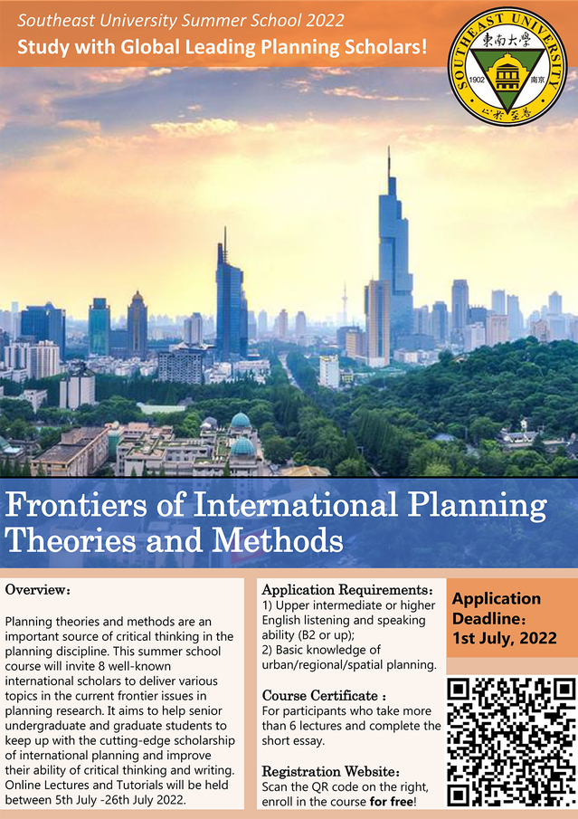 Overview Planning theories and methods are an important source of critical thinking in the planning discipline. This summer school course will invite 8 well-known international scholars to deliver various topics in the current frontier issues in planning research. It aims to help senior undergraduate and graduate students to keep up with the cutting-edge scholarship of international planning and improve their ability of critical thinking and writing.Online Lectures and Tutorials will be held between 5th July -26th July 2022. Students who are interested in the subject are welcome to register for free!