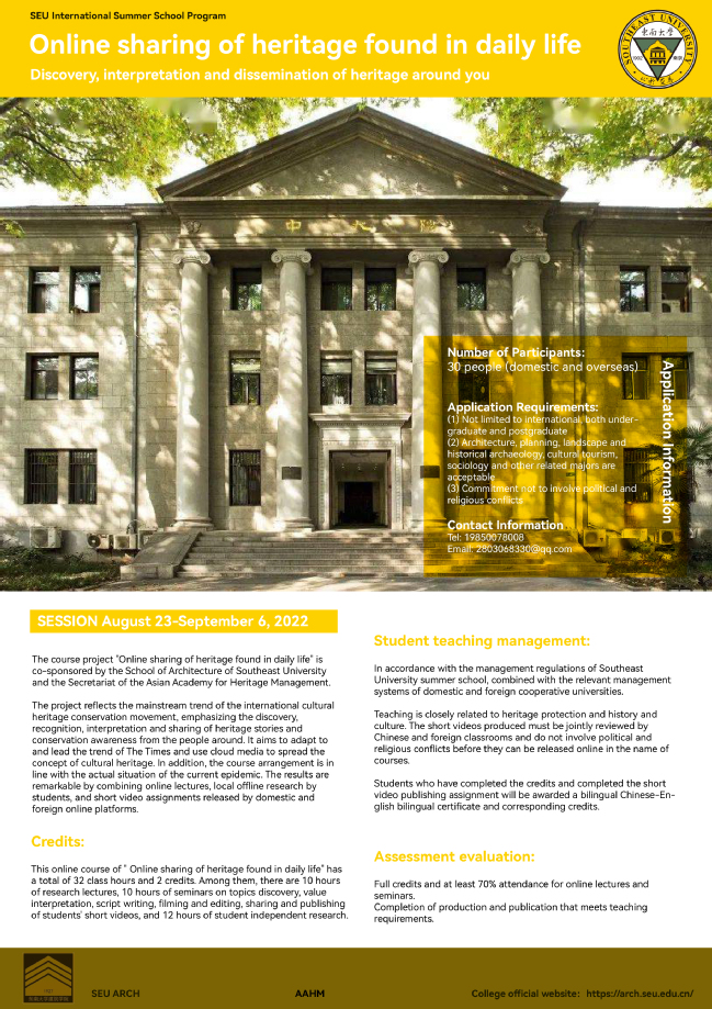 The project reflects the mainstream trend of the international cultural heritage conservation movement, emphasizing the discovery, recognition, interpretation and sharing of heritage stories and conservation awareness from the people around. It aims to adapt to and lead the trend of The Times and use cloud media to spread the concept of cultural heritage. In addition, the course arrangement is in line with the actual situation of the current epidemic. The results are remarkable by combining online lectures, local offline research by students, and short video assignments released by domestic and foreign online platforms.