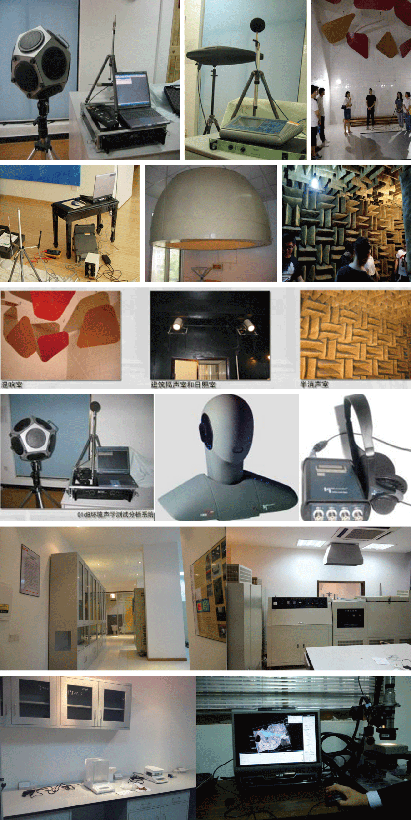 实验室主要包含:(1)大型建筑环境舱动态实验平台;(2)建筑声学实验平台;(3)建筑光学实验平台;(4)建筑热工实验平台;(5)建筑材料性能退化实验平台;(6)建筑性能现场检测及监测平台;(7)建筑性能模拟分析平台等7个专业实验平台。实验室已具备了对复杂建筑环境(如环境噪声、室内声场、室内外风场、温度场、太阳辐射、室内外光环境、室内空气品质及舒适度以及建筑节能关键指标、建筑热工设计缺陷检查、房间气密性等)综合测试和评估分析的能力。