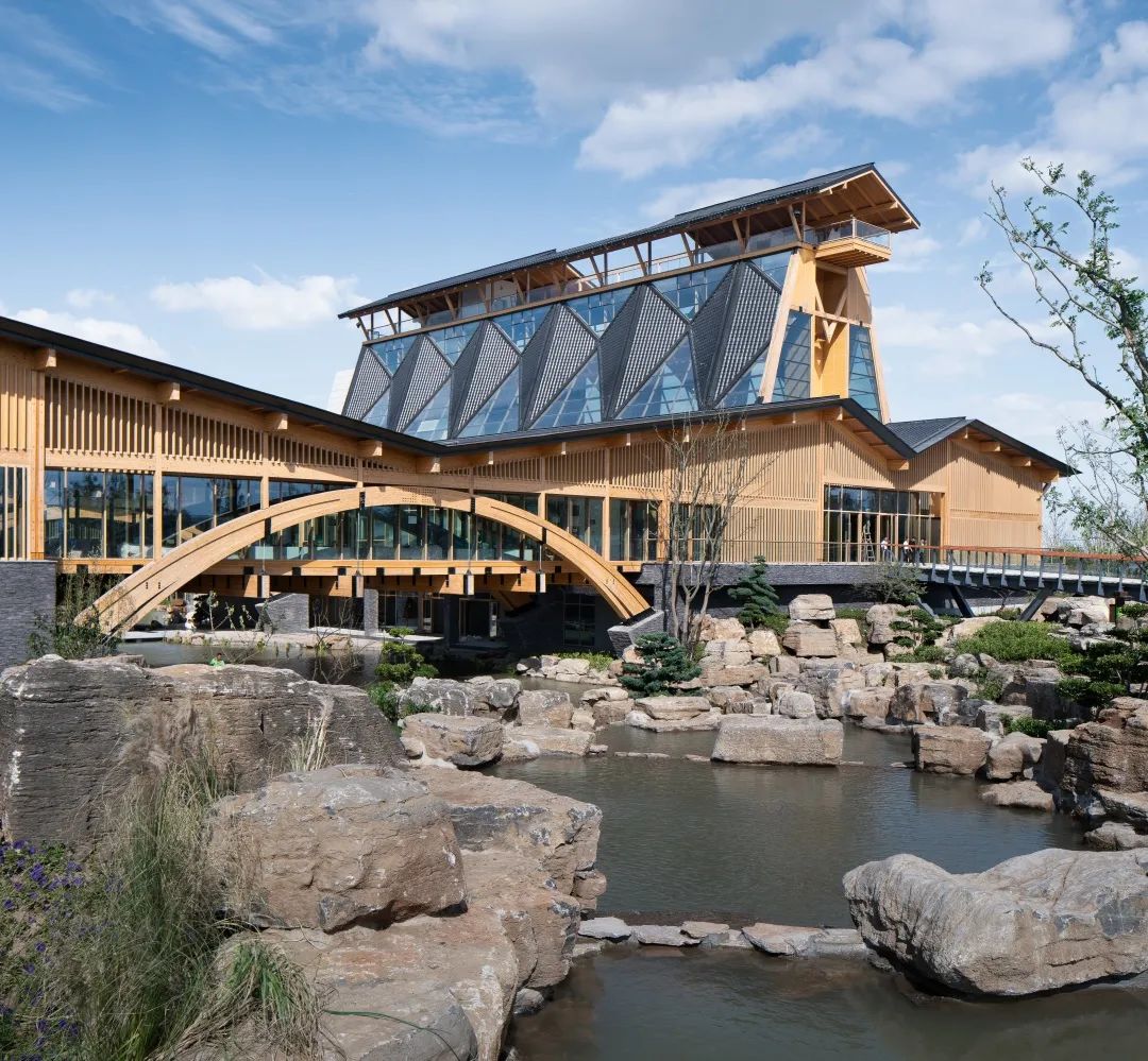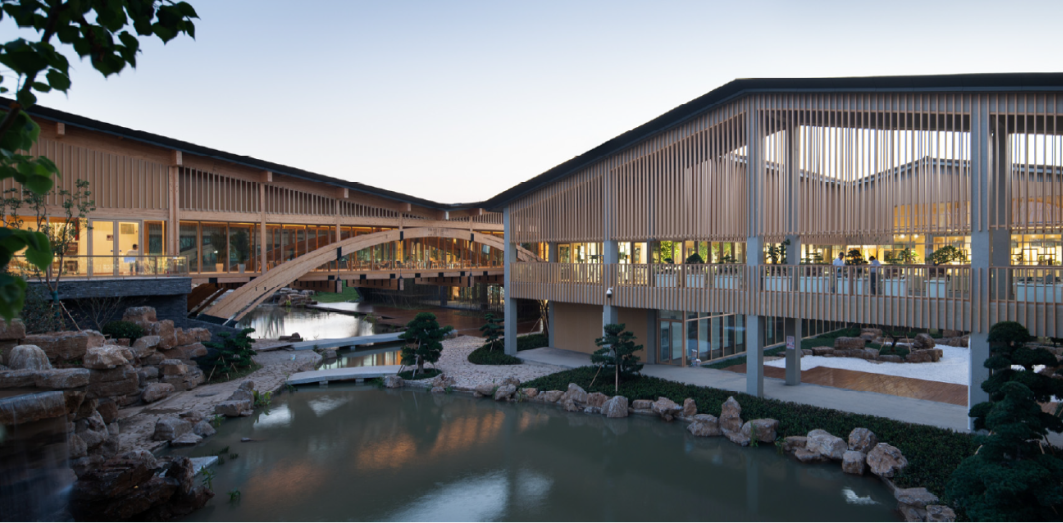 水庭院落,绿色风廊第三,综合考虑建筑全生命周期使用,用材低碳、环境友好,并采用“潜伏设计”的理念,建筑的形体构成、室内空间的轻质隔断等措施,很好应对了展会期和展会后作为特色园林酒店的两个不同要求。技术先进、安全可靠、实用方便,是对园艺博览会展馆这一类建筑可持续设计的示范。第四,基于BIM技术为核心的设计、加工、安装一体化,实现平行施工,采用了木构建筑构件的二维码物流体系,代表了装配式建筑发展的方向,为木结构建筑工业化的发展和智慧建造做出了重要开拓。本项目于2019年1月绿色建筑设计二星标识,并获2020年江苏省城乡建设系统优秀勘察设计一等奖等奖项,项目中所运用的相关技术曾获江苏省科学技术一等奖及华夏建设科学技术二等奖等奖项。项目建成后影响广泛。曾作为建筑学专业最高级别期刊《建筑学报》以及A&HCI检索期刊Frontiers of Architectural Research 的封面作品;王建国院士曾在多个建设行业高级别论坛和会议上作主旨报告介绍该项目;中国工程院何镜堂院士、张锦秋院士、江苏省住建厅党组书记顾小平、麻省理工亚洲无码 前院长Santos教授等多位建筑专家莅临参观,给予高度好评。