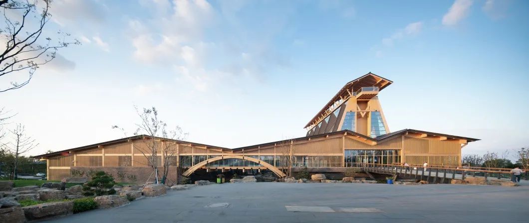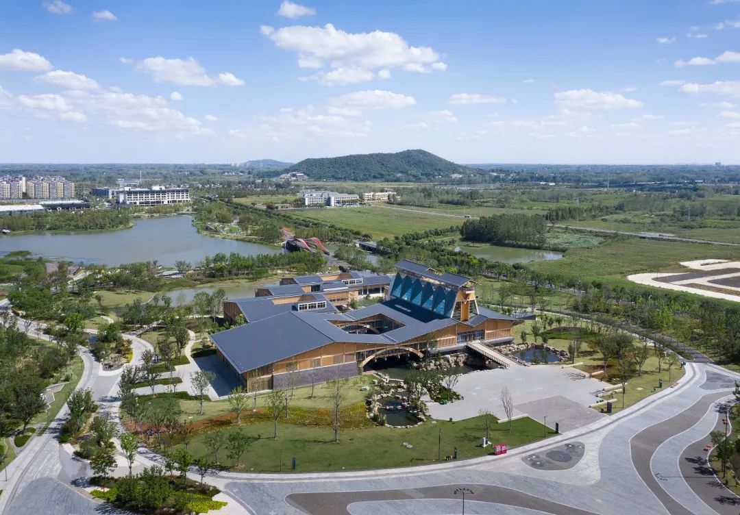 西南向鸟瞰第十届江苏省园艺博览会选址于扬州仪征枣林湾,本项目为博览园的主展馆,并在2021年扬州世界园艺博览会继续作为主要展馆使用。本项目由王建国院士领衔,联合亚洲无码 、南京工业大学及两校建筑设计院的高水平专家团队顶层设计,并依靠建设单位、施工单位的精细化管理和先进施工技术,实现了一座集中华文化意象、显地域特色的新型现代木结构建筑,集中展现了绿色建筑的特色。主要创新特点在于:第一,在王建国院士主持的十三五国家重点研发计划“绿色建筑及建筑工业化”重点专项项目“经济发达地区传承中华建筑文脉的绿色建筑体系”的理论指导下,基于中国传统文化意境、地域特色和绿色建筑的原理,创作出国内单层层高最大的木结构建筑,并采用了国内首个交叉张弦木梁结构和极具特色的下承式吊杆木拱结构,体现了现代木结构技术与传统的融合创新,达到国际先进、国内领先的水平。
