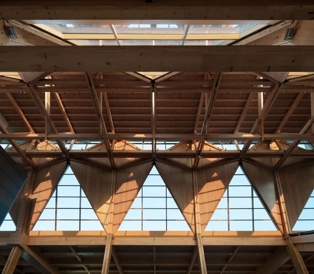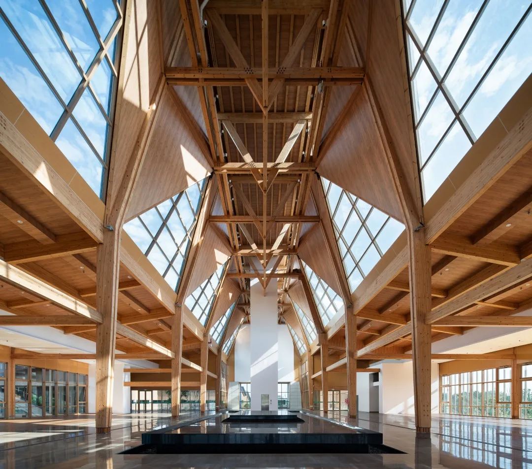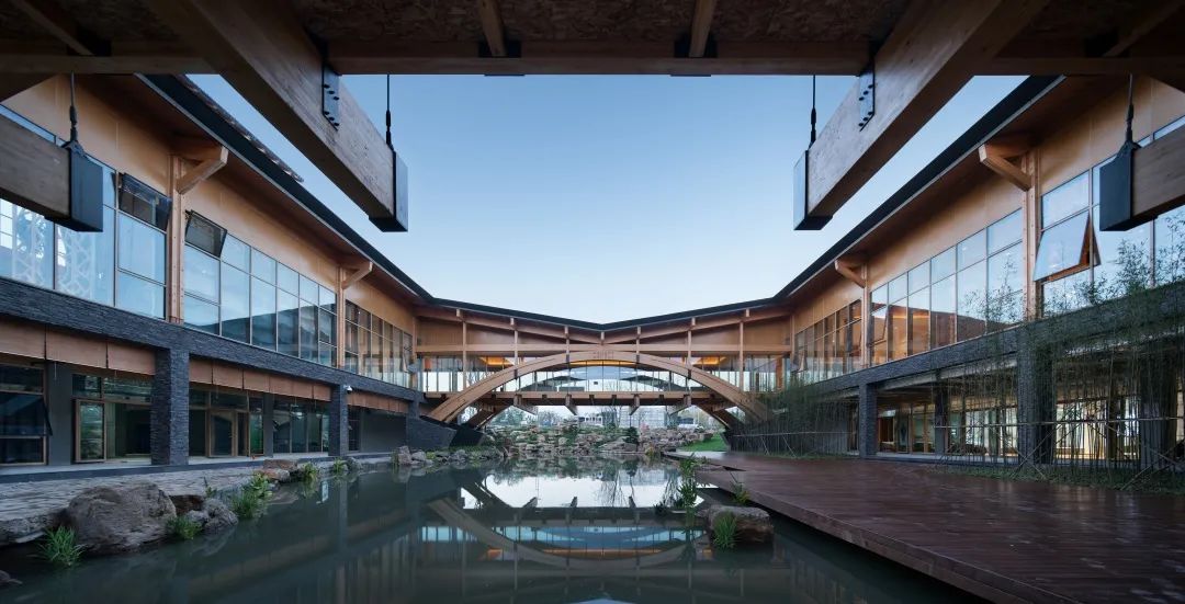 飞虹拱桥(下承式吊杆木拱结构,跨度29.4m,宽8.4m)第二,采用了建筑师主导、各专业协同的整合设计,实现设计目标效益的最大化。设计强调建筑的被动式节能,利用凤凰阁高耸空间的拔风效应,基本实现展览空间的自然通风、降低能耗。南北贯通的水庭将自然引入建筑内部还留出了绿色风廊,改善了各展厅的微气候。由于方案初期建筑师就协同结构、设备、木构、幕墙等专业,很好地解决了裸露的结构和设备管线暗藏的问题。