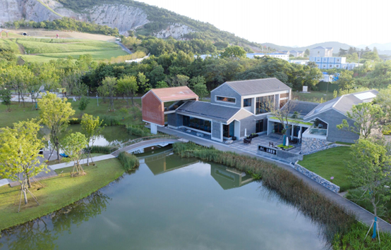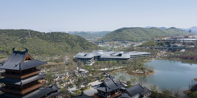 设计方案意境取自金陵八家龚贤画作“云壑松荫图”,以江南民居院落为空间原型,围绕中心半开敞庭院布置功能。造型结合场地岩石较多的特点以传统坡屋顶进行操作变形,以棱角分明的形体呼应“阳山碑材”的明文化主题。建筑位于主场馆对面,现在用作为前来园博园参观游览的游客提供休憩、餐饮等服务。