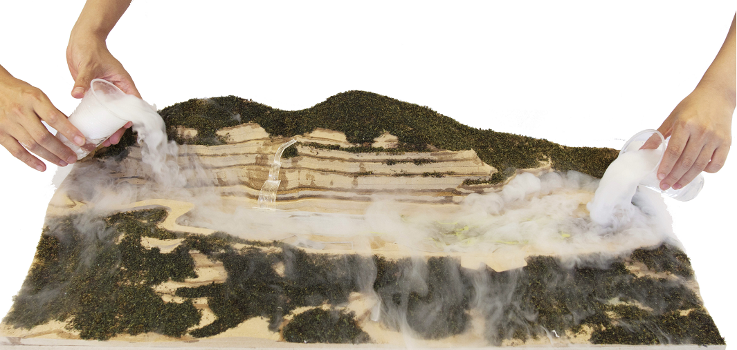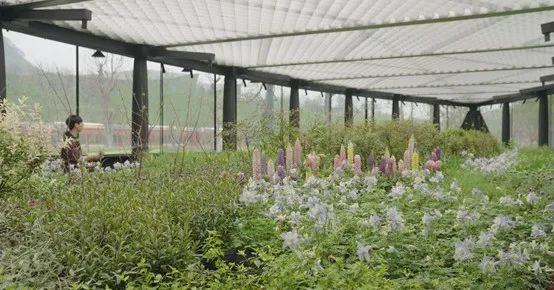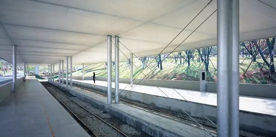 花味驿站是园艺花卉展厅,两侧都是绵长的丘陵景观,展厅将内部的花卉和外部的风景融合起来。当人们从炎热的室外走进这个阴凉的空间,光线也被帘幕过滤得柔和,可以在长长的吧台边任选一个位置,面对风景,静下心来喝杯咖啡。花味驿站前的小火车站则试图用最朴素的语汇融入周围的环境。站台基础作为立柱的抗侧,地面以上没有纵向的结构,只留下一榀一榀的框架阵列,整个车站显得简单而清晰。