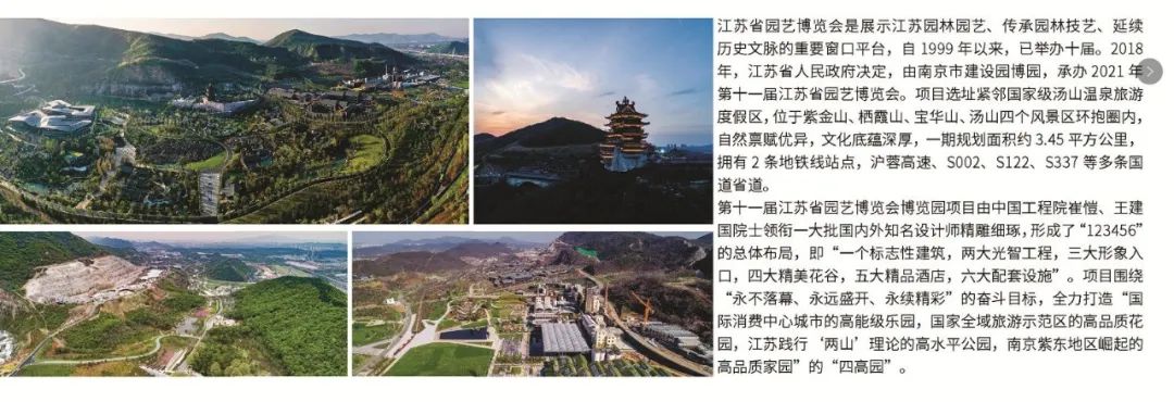 以“锦绣江苏·生态慧谷”为主题的第十一届江苏省园艺博览会已于2021年4月16日在南京江宁汤山盛大开幕。本届园博会选址在南京江宁开山采石的宕口和水泥厂旧址,占地面积约3.45平方公里,通过园博园建设修复了城市曾经的生态伤疤,通过对江苏各地经典名园的当代创新表达,对工业遗产的当代活化利用,实现了生态修复基础上的文化传承创新,生动演绎了生态修复、城市修补的精彩蝶变,呈现了别样的园博精彩。是江苏省进一步践行“绿水青山就是金山银山”理念,为推进美丽江苏建设、打造美丽中国现实样板作出的努力;是江苏持续用好园艺博览会成功经验,继续践行绿色城乡建设发展理念,始终坚持以人民为中心的思想,为“十四五”时期全国住房城乡建设事业的高质量发展探索更鲜活、更有示范推广意义的实践案例。南京市将以“永不落幕、永远盛开”为目标,努力把园博园打造成为旅游新热点、城市新名片、发展新平台,展示“创新名城、美丽古都”新风采。